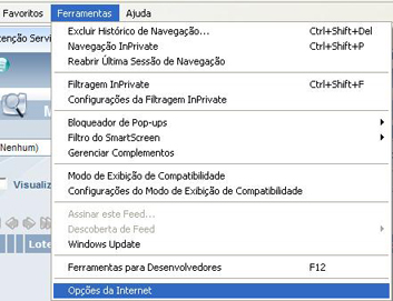 3º Passo: Clique no menu Ferramentas, e depois em Opções de Internet: